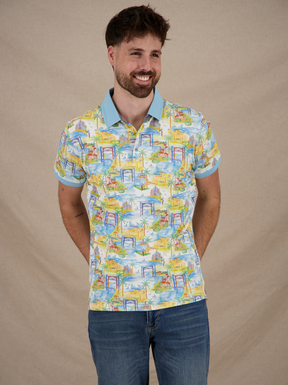 The Polo Impression Island brings sunny vibes with its playful island illustrations. Featuring palm trees, ocean views, umbrellas and cozy houses, the print captures the essence of a tropical getaway. The contrasting collar adds a stylish finishing touch.