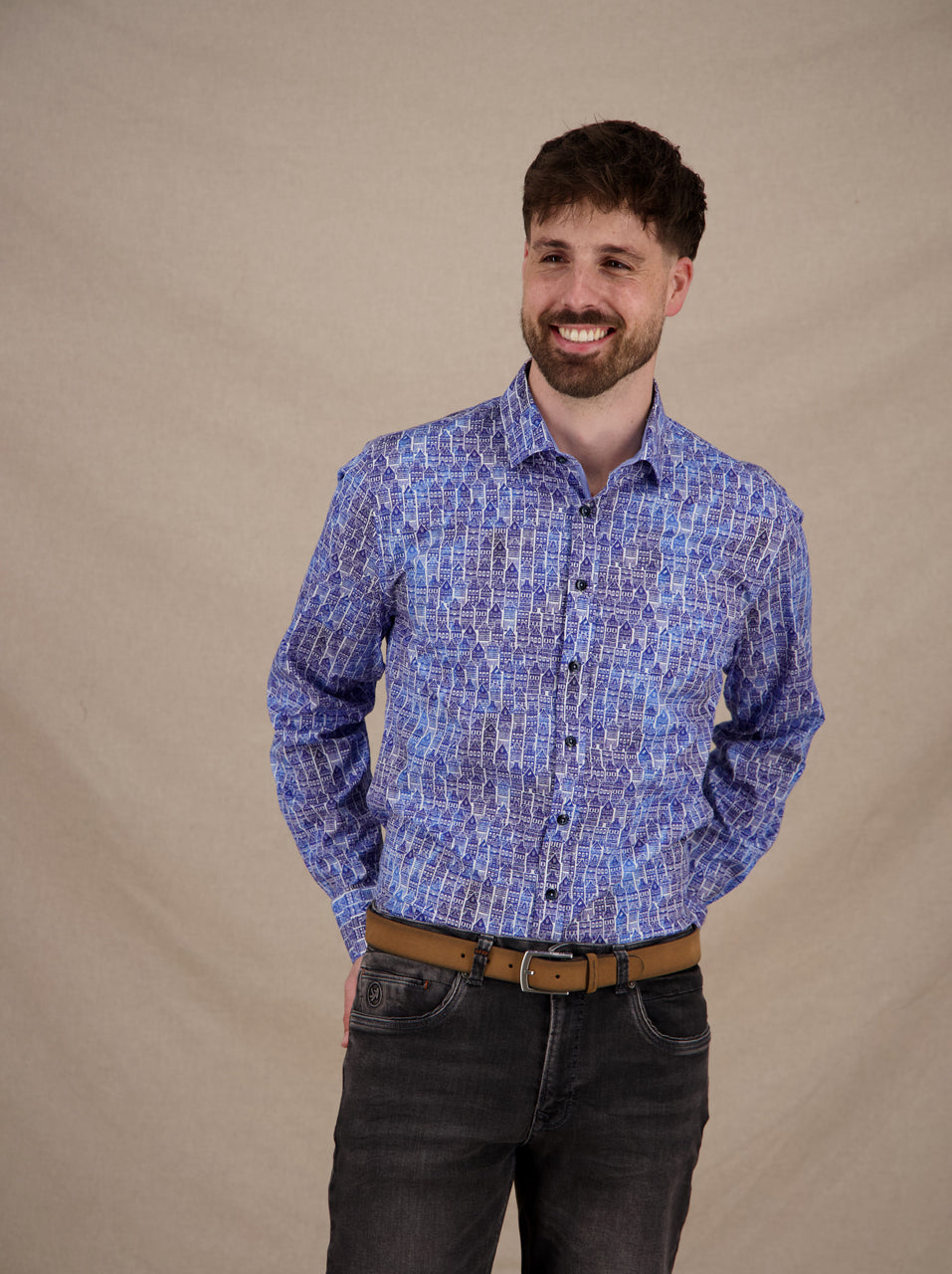 A navy blue shirt featuring iconic Amsterdam canal houses as a bold print—playful, stylish, and perfect for those who embrace colorful flair.