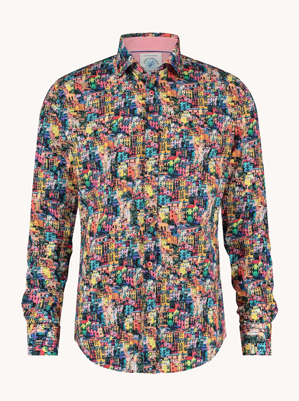 A colorful shirt featuring prints inspired by Cinque Terre fishing villages. Made with stretch cotton for comfort.