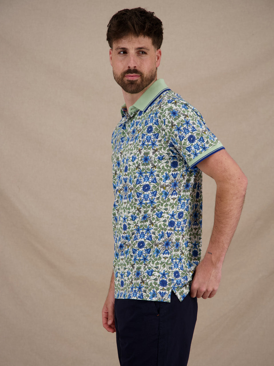 Das Polo Art Nouveau vereint klassische Eleganz mit sommerlicher Frische. Das durchgehende florale Muster ist vom Jugendstil inspiriert und in zwei Farbvarianten erhältlich: Grün mit Blau oder Orange mit Blau. Kragen und Ärmelbündchen setzen farbliche Akzente. Hergestellt aus einer atmungsaktiven Baumwollmischung – perfekt für warme Tage.