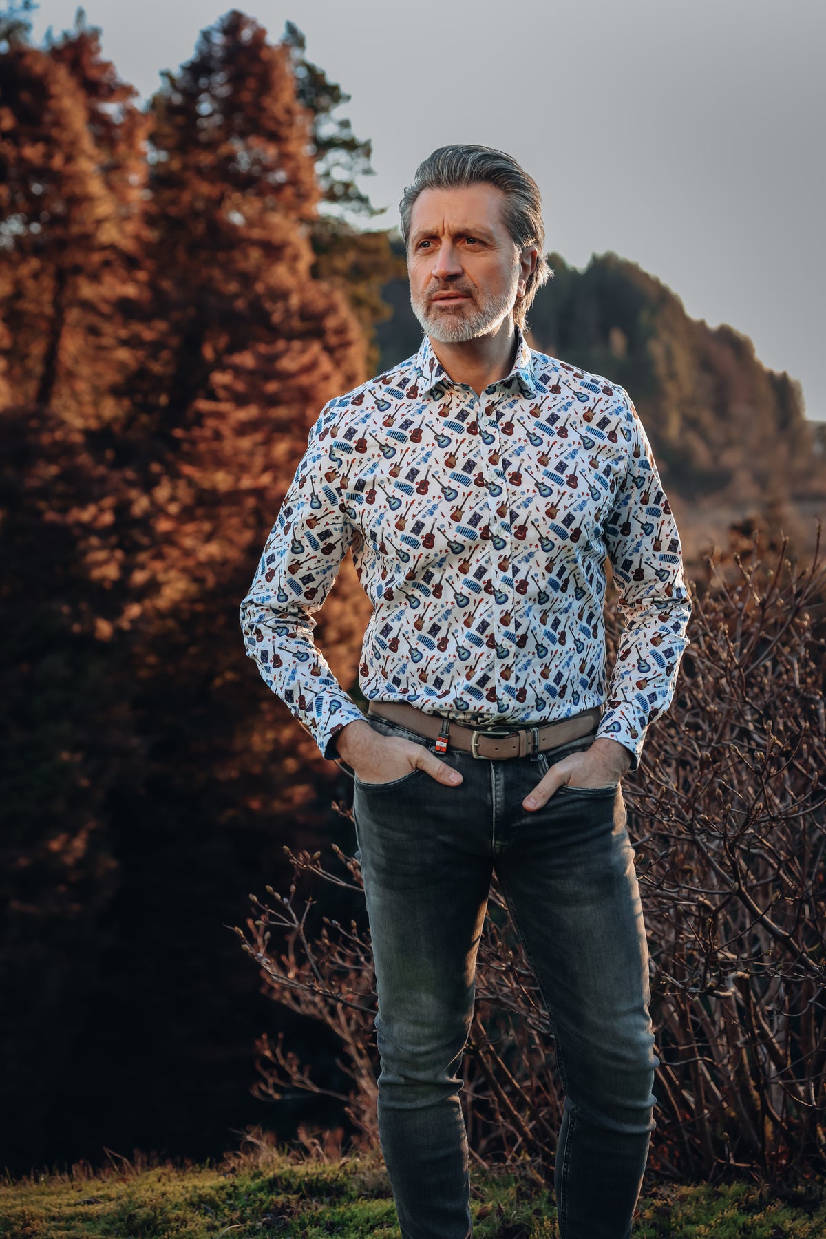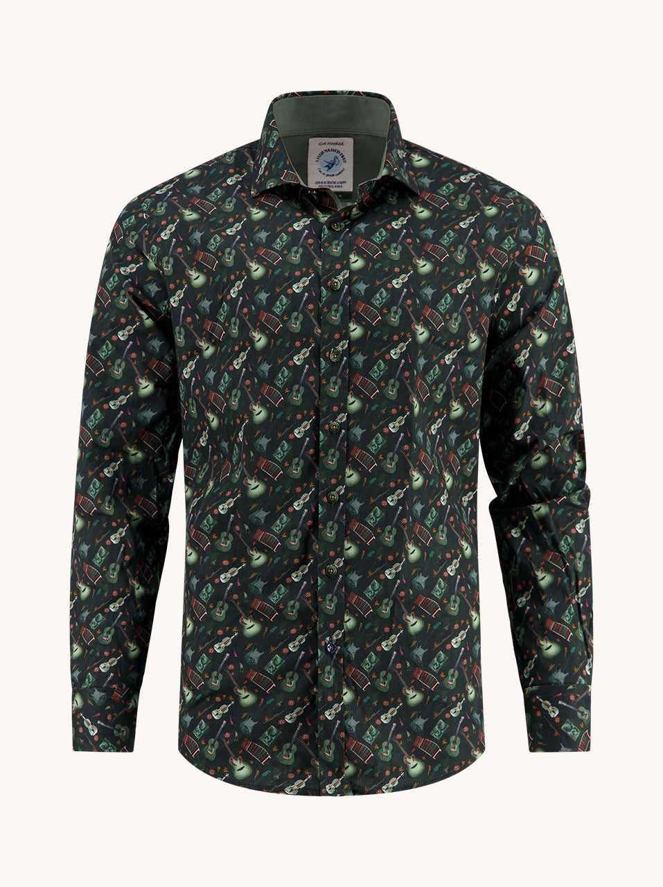 Triff den richtigen Ton mit diesem Hemd von A Fish Named Fred! Der originelle Gitarren-Print beweist: Stil und Musik gehören zusammen. Perfekt für den Abend oder Casual Friday – dieses Hemd rockt immer.