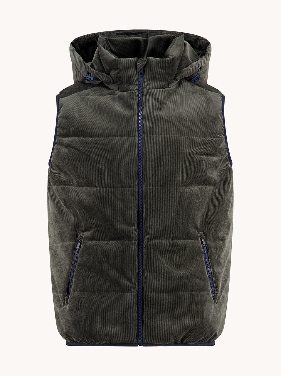 Bodywarmer van ribstof met capuchon. Comfortabel en warm, ideaal als extra laag in de winter.