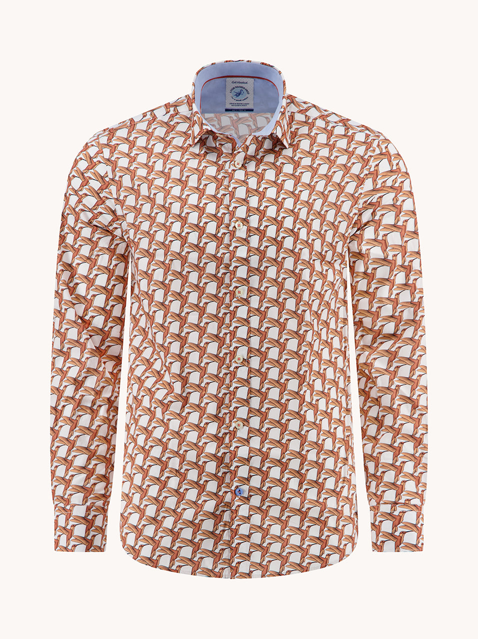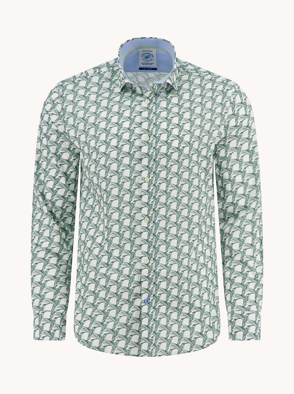 Een vogelshirt. Maar dan op Fred-niveau. Het Overhemd Geometric Birds van A fish named Fred neemt het klassieke vogeldessin en maakt er iets nieuws van. Met een opvallende all over geometrische print vol gestileerde vogels is dit shirt allesbehalve gewoon.